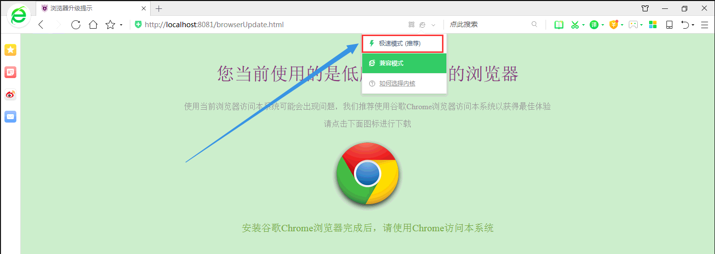 1.2. 在弹出的菜单中点击极速模式,切换到极速模式后即可正常访问本系统